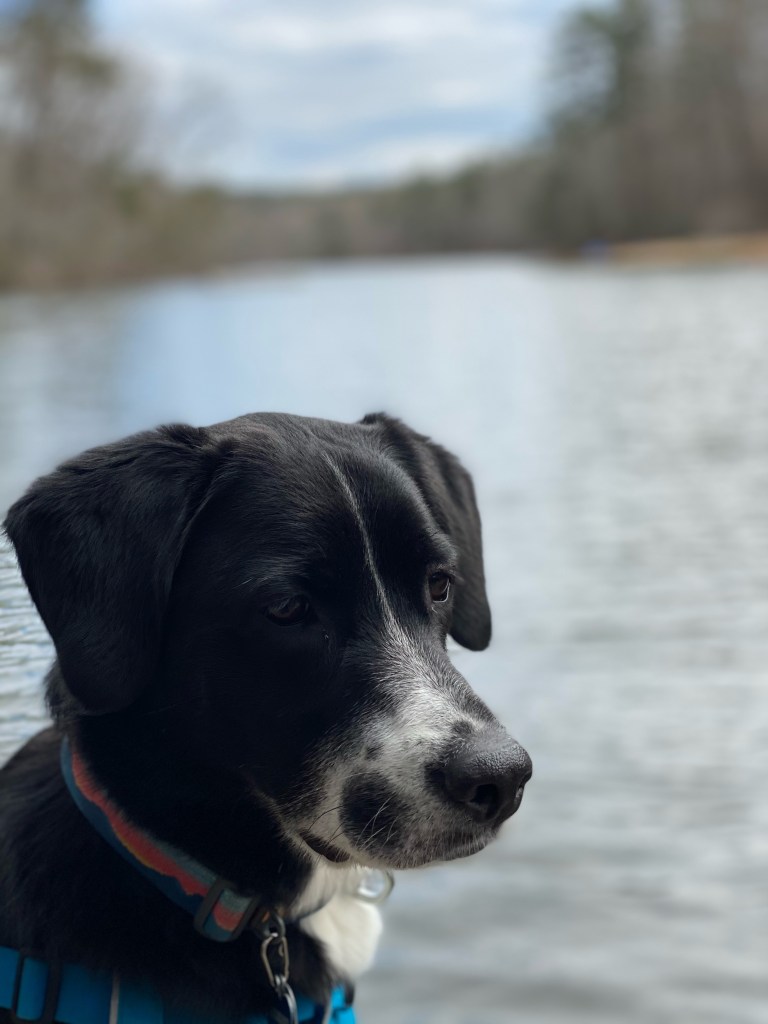 Once we made it home, we spontaneously decided to go on a hike. We live at the foot of the Blue Ridge Mountains, so hiking is pretty popular around here. The sun was so bright and the sky so blue, it beckoned us to be out in it. So, we put on our hiking boots that our daughter coerced us into buying when we first moved here, loaded the dog, and headed out; excited for a low key hike around a beautiful lake. It was still very cold and I couldn’t find my ear muffs, but that didn’t deter us.