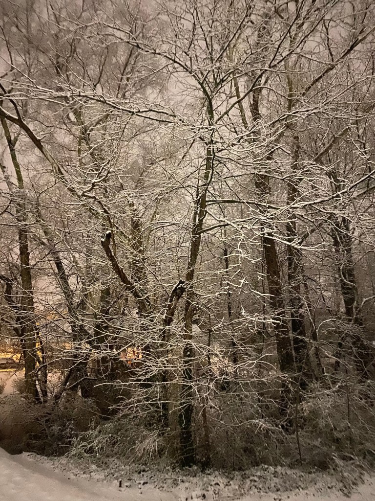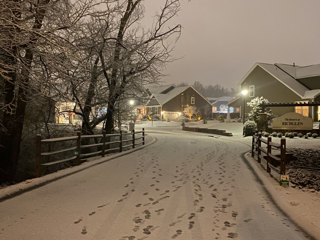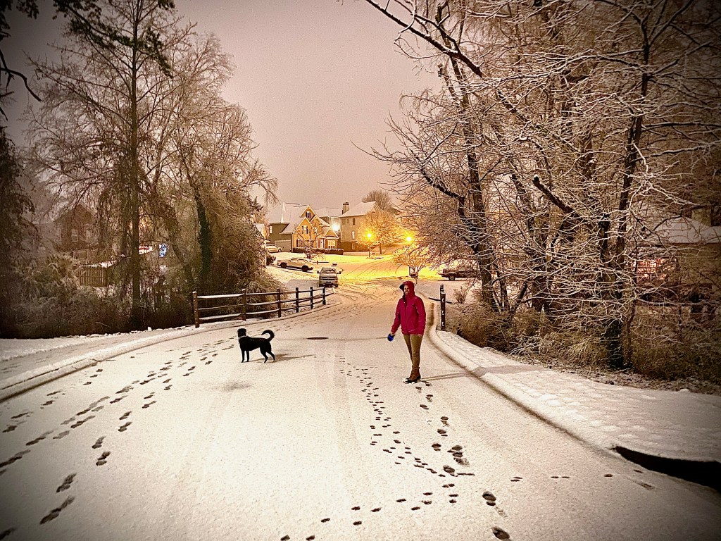 My husband knew immediately that we should walk around in the magical fairy dust falling from the sky, but I was convinced we should look at it from the window. And that’s what we did, for a while. Finally, after some discussion about this being “so special” and “who knows if it would happen again this year” and “why not’s,” I was convinced I really did need to go outside and enjoy the moment. So we put on our boots and warm coats and headed out the door. Oh, and of course, we brought our rescue pup. Can’t step out the door without her, she thinks she’s human. We strolled around the loop of our neighborhood, snow sparkling in the moonlight as it fell all around us. It really was amazing and I would’ve been so disappointed if I’d missed it. The kids from nearby houses were squealing and rolling snowballs into snowmen, laughing and catching snowflakes on their tongues.