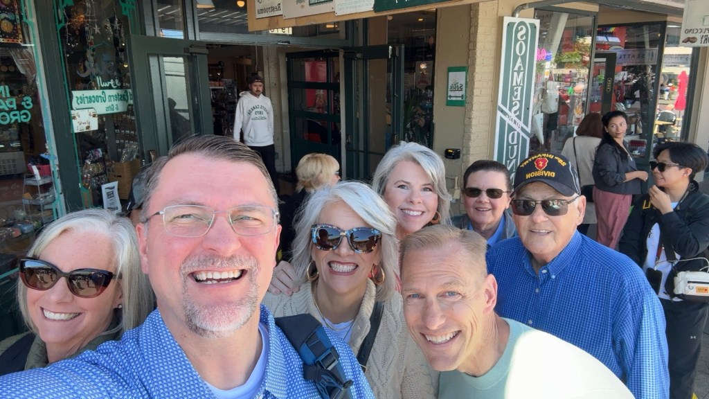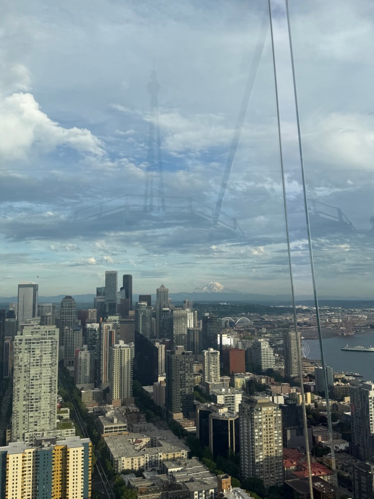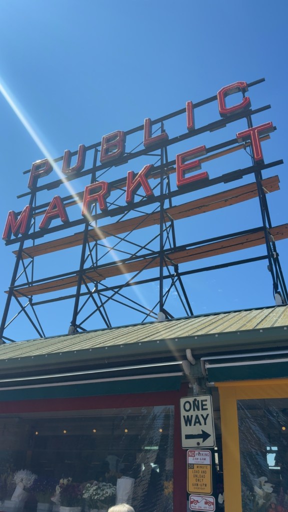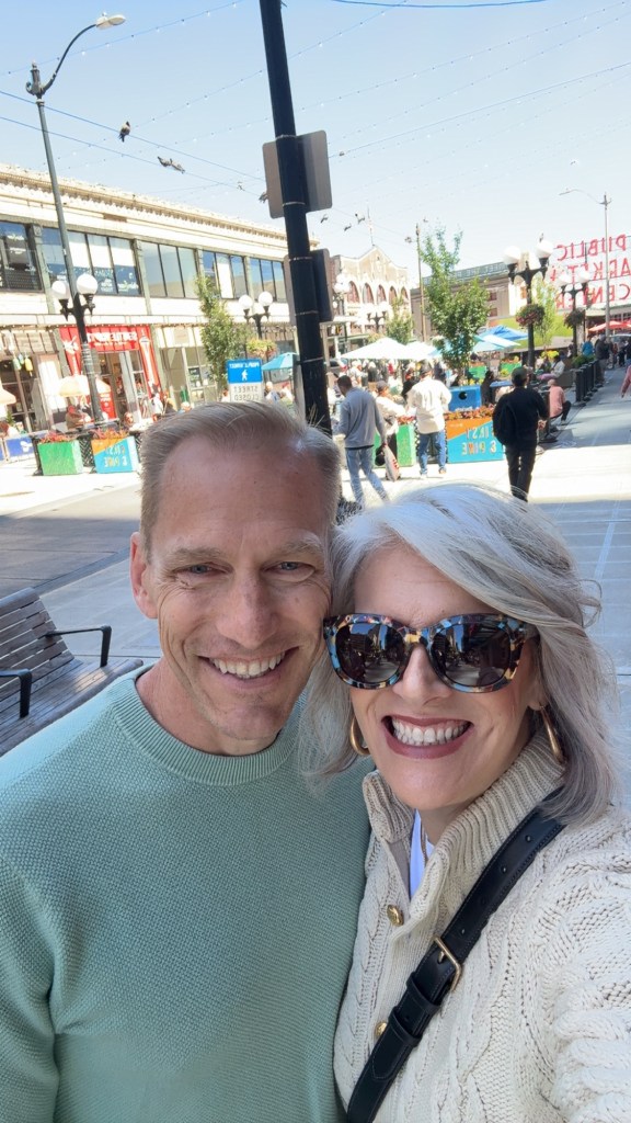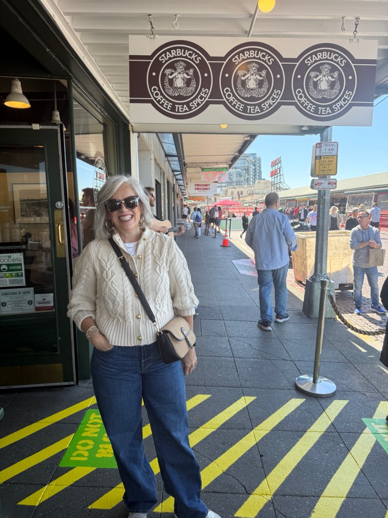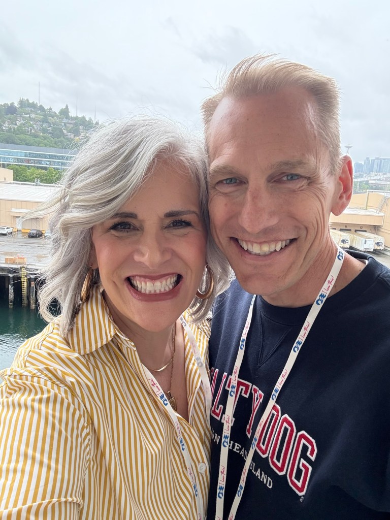 Our cruise began in the port of Seattle, Washington. I’d never been to Seattle, Jeff had only been to the airport there. We went a couple of days before our cruise was set to leave port to make sure we got there in time. Not so fun fact, Jeff has seen people miss funerals, weddings, cruises, graduations, you name it, because they planned their flight with no time to spare before their event, not leaving any room for delays and cancellations, so we’ve learned to go early. We stayed downtown and walked to a great little pizza bistro for dinner. I love a dive; they’re usually local and, so often, the food is amazing. Our group of six barely fit into the ragtag restaurant and we were very close to the kitchen, so we watched as a pizza pro threw our crust at least six feet in the air as he shaped it for the pan. We hadn’t been in Seattle long, having only recently landed from all over the southeast, so the conversation was easy and joyful. We were all so excited for the days ahead and what we might see in Alaska. The next day we explored the port of Seattle and saw the original Starbucks! Definite highlight for me. Then we walked along the dock and checked out the market, enjoyed the aquarium and then Jeff and I went to the Chihuly Garden and Glass and were entirely blown away with the beauty. I never knew glass could take on so many shapes and be so amazing. We closed out the day at the Space Needle, the views were amazing, and the rotating floor was so cool!