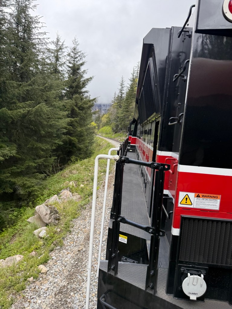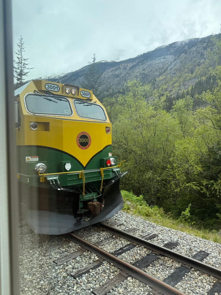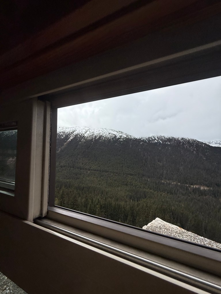 First, we had to get from the ship to the shore and there was no dock connecting the ship to shore; instead, we were loaded into floating small boats called tender boats, they are enclosed and hold about a hundred people. It kind of felt like we were in a floating pod and it only took a few minutes to get us from the ship to the shore where we could disembark and head for the train. Of course, as is common in Alaska, it was raining and cold; we were really glad it wasn’t a far walk to the train. Once we got to it, we found our seats in the first car, thankfully we got to sit together as a group. It felt like we stepped back in time as the train was old, or at least made to feel old, and I kept thinking what it must’ve been like when trains were the primary source for travel. Wow, we’ve come a long way.