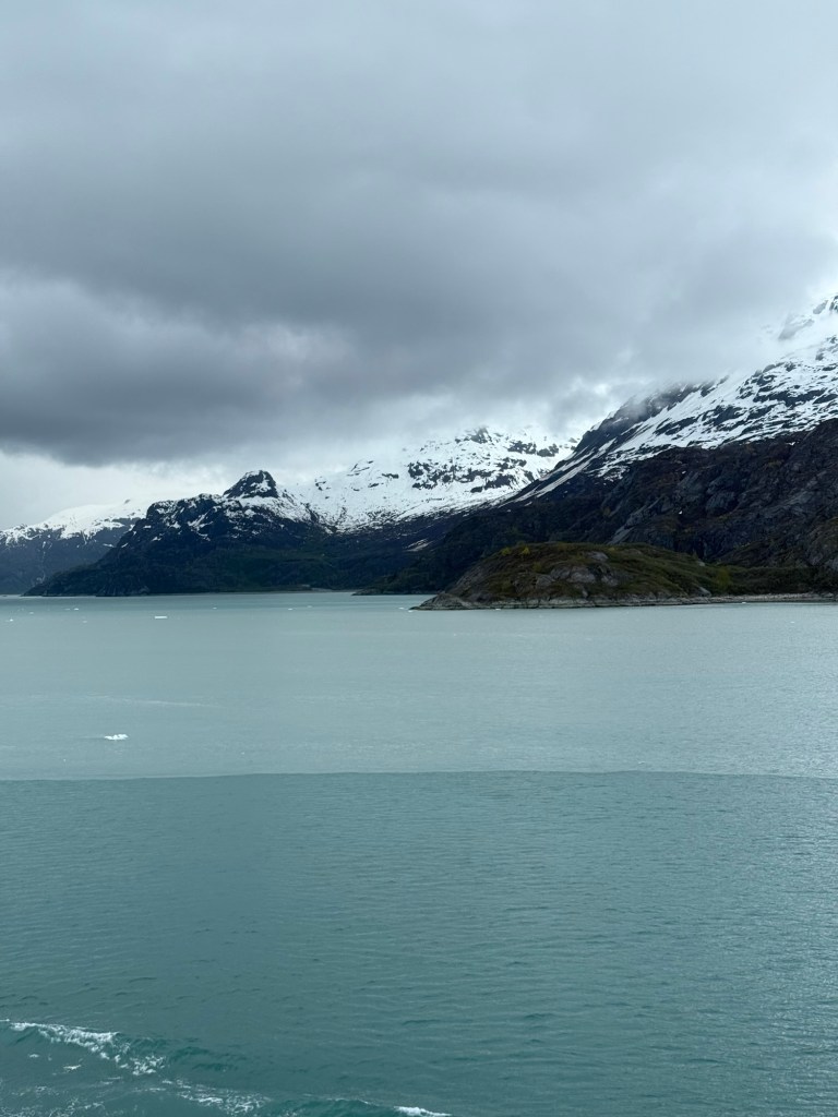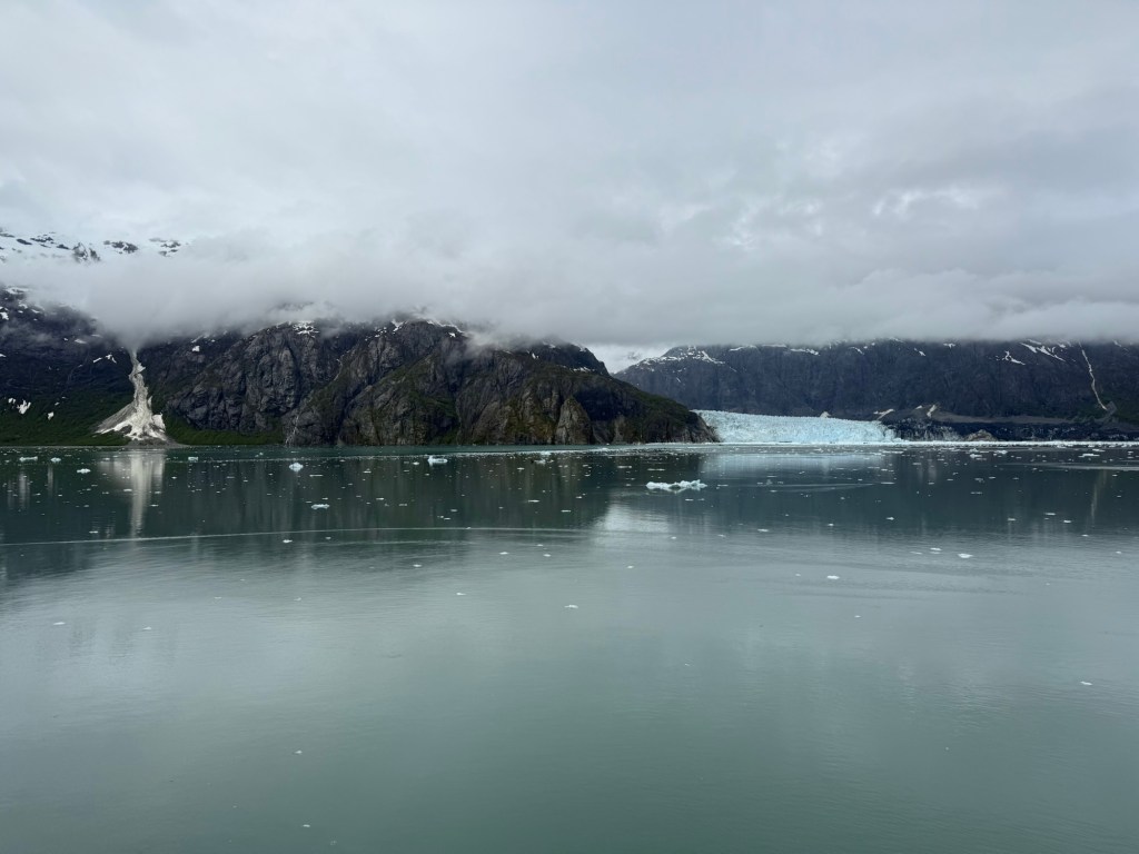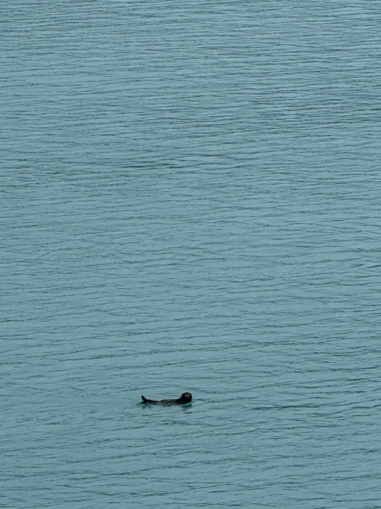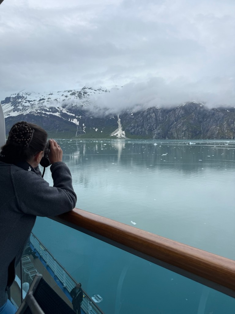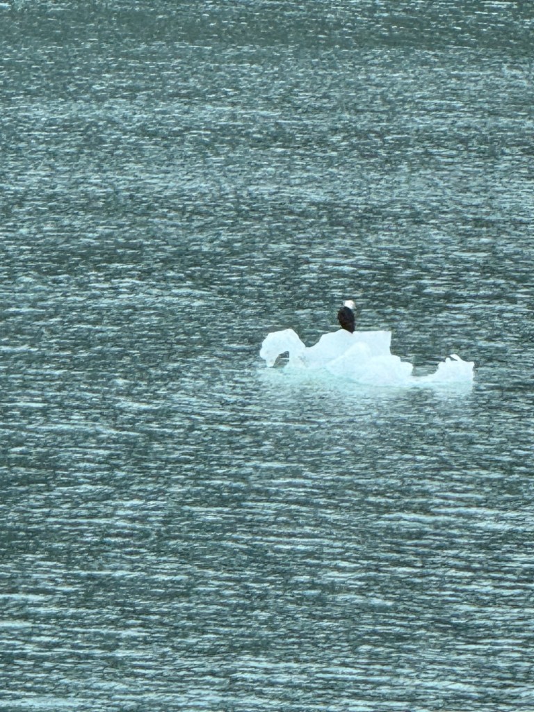 We woke up Wednesday morning to the grandest views we’d seen yet. The ship slowed down to an almost crawl so you could see the gorgeous mountains and waters that make up the National Park. The water is the most brilliant blue; kind of reminds me of the Caribbean. It’s amazing because there’s a visible line in the water separating the darker sea waters from the waters that make up the park. I looked up why the water looks almost turquoise and Google said it’s because of something called “rock flour.” Basically it’s the tiny granules of rock, as a result of glaciers grinding over the bedrock, which are suspended in the water. When the sun interacts with the tiny particles it creates the turquoise effect. The brilliant water against the back drop of snow topped mountains, with water falls winding down that looked like giant icicles in the sunlight, was like something you see in movies. I still can’t believe I got to see it in person. The ship, once it reached the end of the park, basically a dead end in the water, made a one eighty turn so we could see the other side of the park on our way out. This was the day we enjoyed our balcony the most. We used our binoculars and saw little otter families floating near the glaciers and a bald eagle sitting majestically on floating ice. The one thing we never saw, and I’m truly disappointed about this, was a whale. It just wasn’t meant to be, I guess.