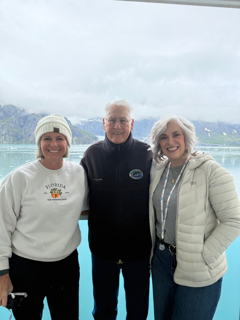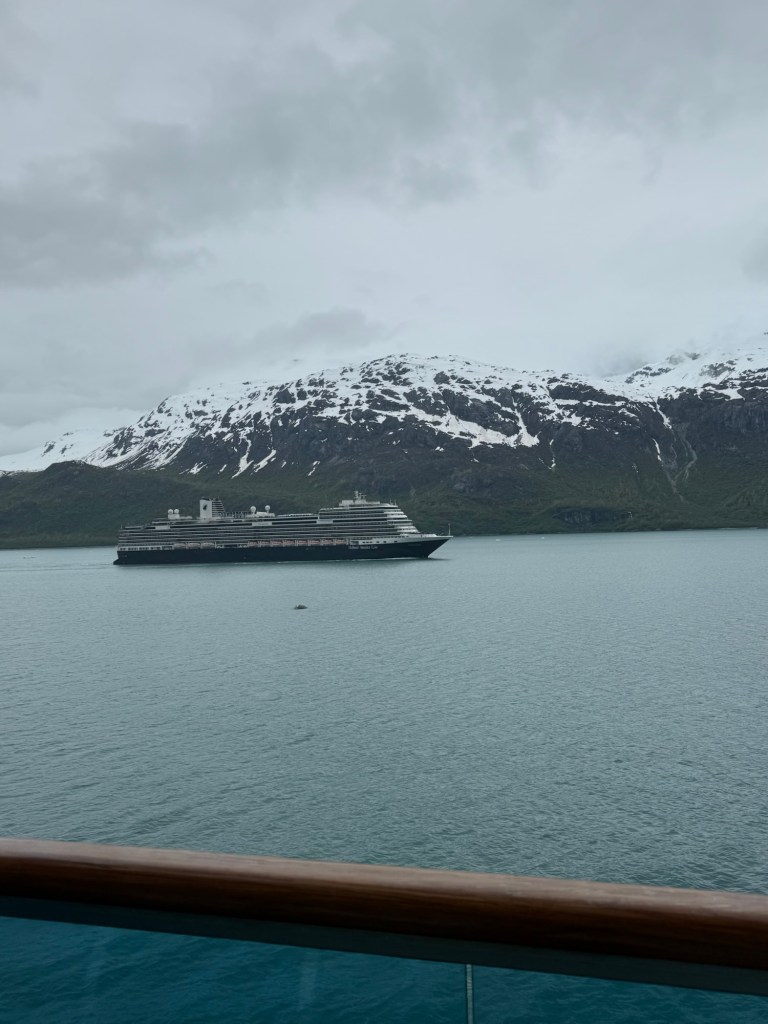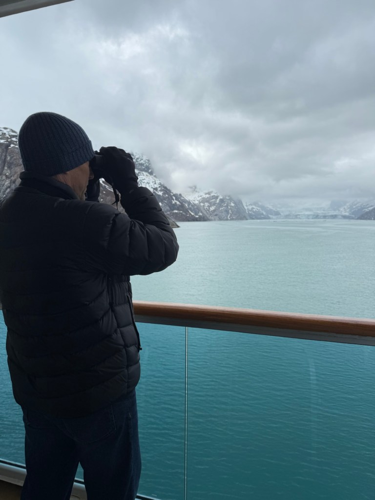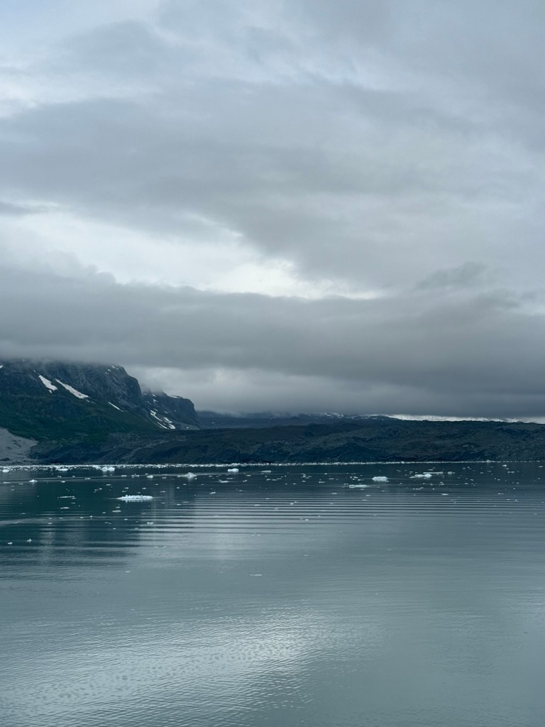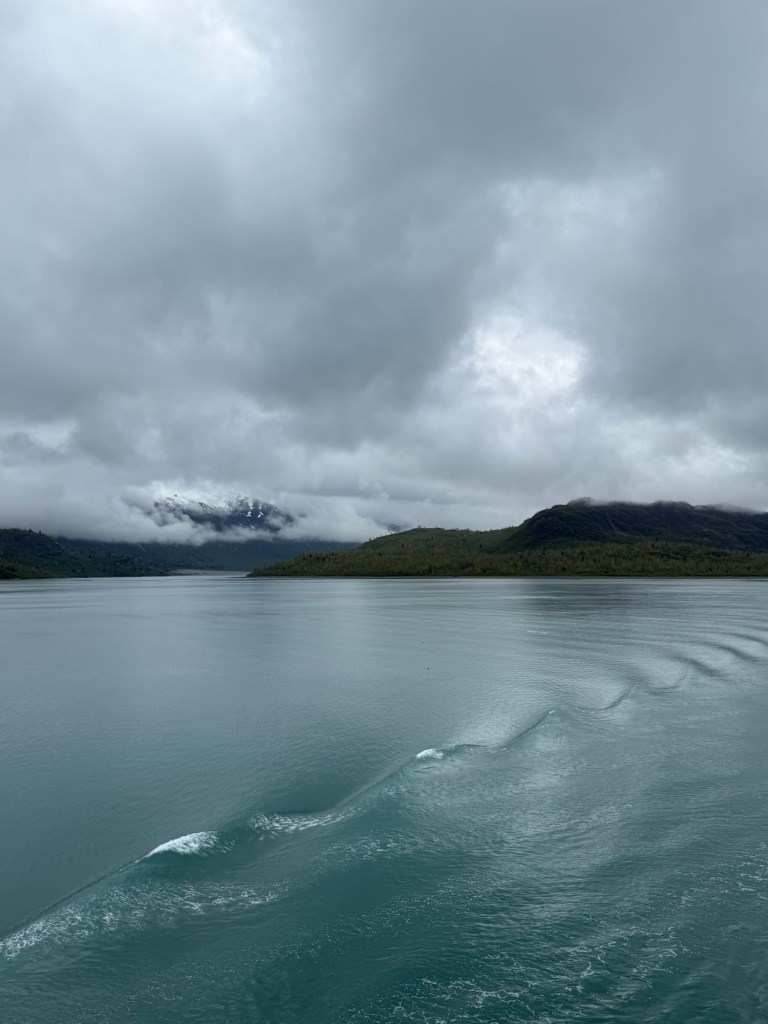 We woke up Wednesday morning to the grandest views we’d seen yet. The ship slowed down to an almost crawl so you could see the gorgeous mountains and waters that make up the National Park. The water is the most brilliant blue; kind of reminds me of the Caribbean. It’s amazing because there’s a visible line in the water separating the darker sea waters from the waters that make up the park. I looked up why the water looks almost turquoise and Google said it’s because of something called “rock flour.” Basically it’s the tiny granules of rock, as a result of glaciers grinding over the bedrock, which are suspended in the water. When the sun interacts with the tiny particles it creates the turquoise effect. The brilliant water against the back drop of snow topped mountains, with water falls winding down that looked like giant icicles in the sunlight, was like something you see in movies. I still can’t believe I got to see it in person. The ship, once it reached the end of the park, basically a dead end in the water, made a one eighty turn so we could see the other side of the park on our way out. This was the day we enjoyed our balcony the most. We used our binoculars and saw little otter families floating near the glaciers and a bald eagle sitting majestically on floating ice. The one thing we never saw, and I’m truly disappointed about this, was a whale. It just wasn’t meant to be, I guess.