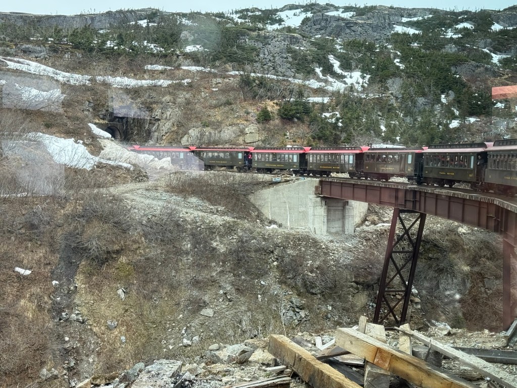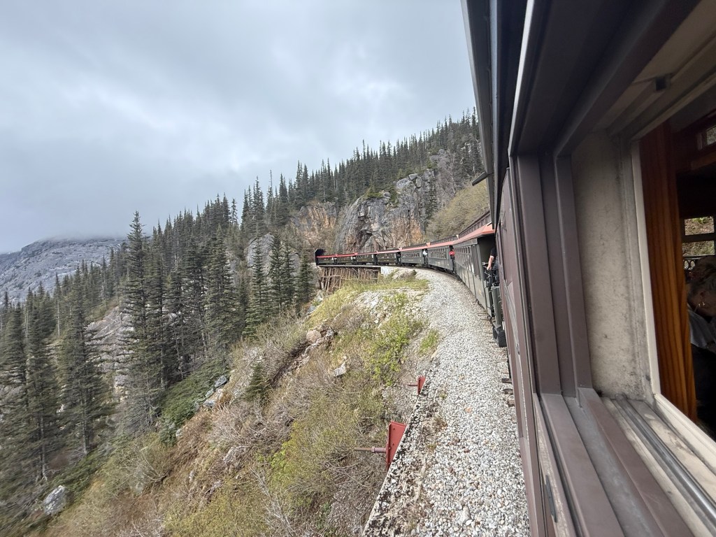 It was in Skagway we would ride the White Pass & Yukon Railroad up the White Pass Summit; it climbs nearly three thousand feet in twenty miles. It passes over bridges made from wood, through tunnels and along the side of a cliff, it was AMAZING!! Apparently it follows the historic route used by miners during the Klondike Gold Rush. You know, I never knew until this cruise that Klondike ice cream bars were named after the Klondike Gold Rush, the name implies cold treasure just like the men who went searching for gold in Canada. You learn something new every day.