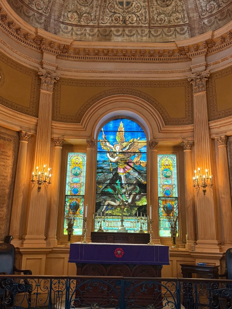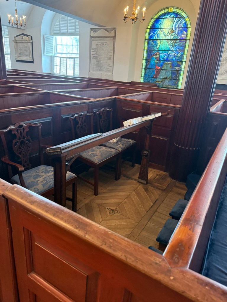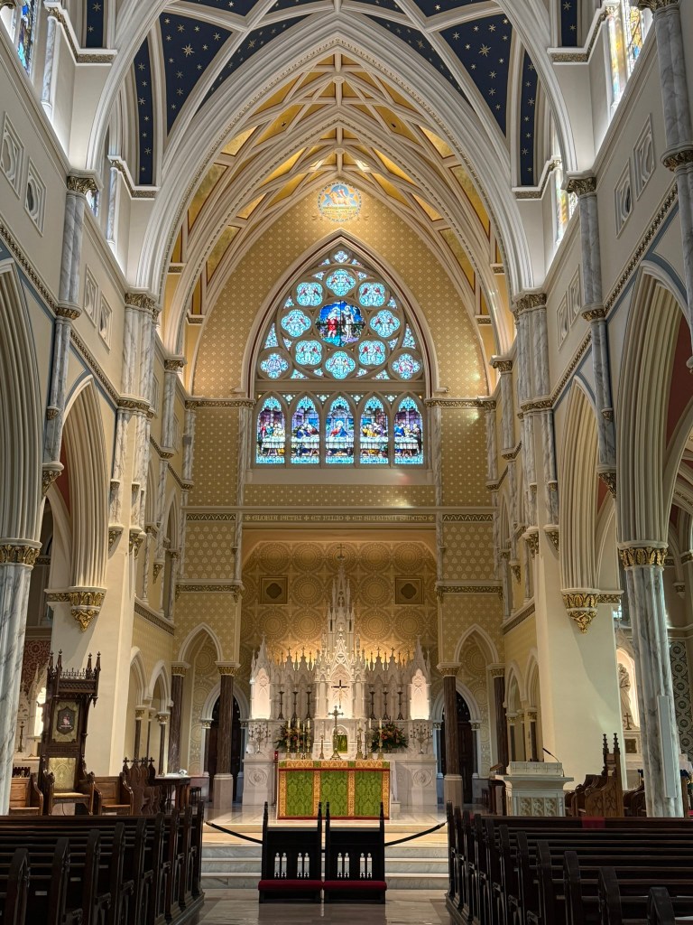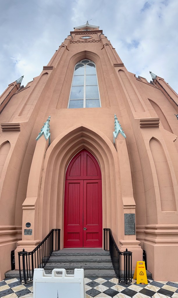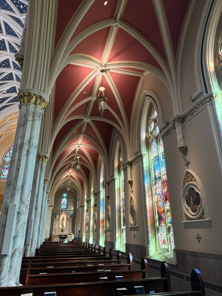 The next morning, we rose kind of early and asked the internet for a church tour. We LOVE old downtowns and old church buildings. We found an itinerary that would work and, after having a delicious breakfast served to our room, we started out. So many beautiful buildings with so much history! At St. John the Baptist’s Catholic Church, we sat quietly in the pew for a bit and took it all in. The gorgeous woodwork, the colorful stained-glass windows, the ornate ceilings and walls, it really was a sight to behold.