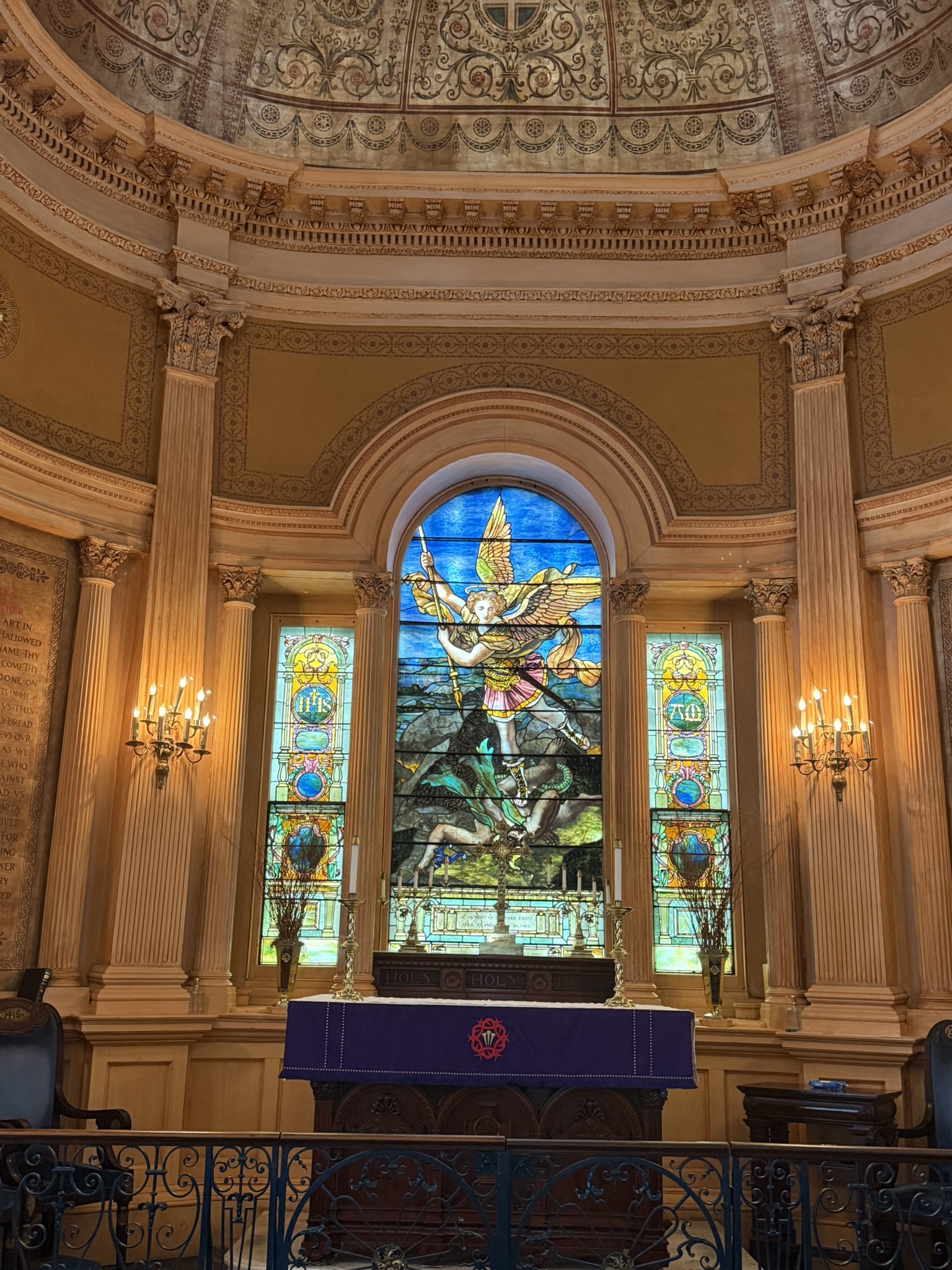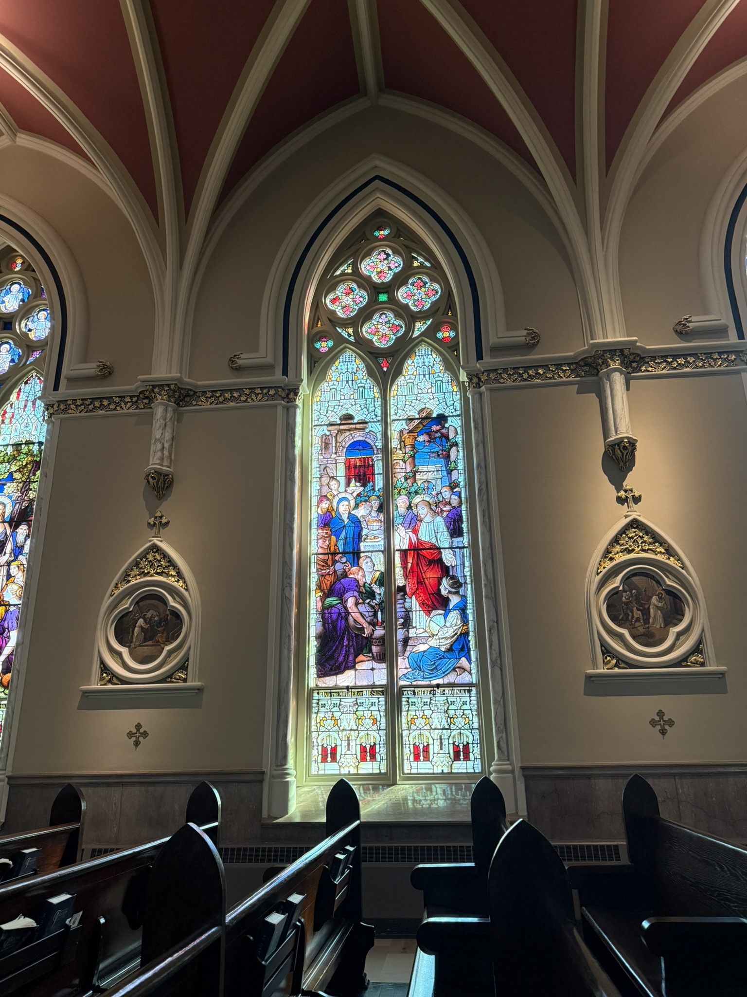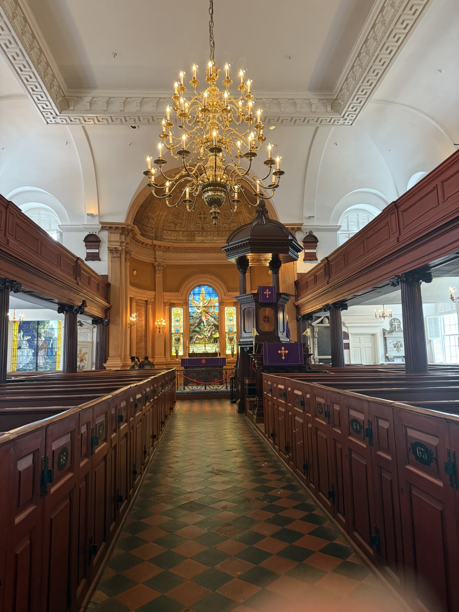 The next morning, we rose kind of early and asked the internet for a church tour. We LOVE old downtowns and old church buildings. We found an itinerary that would work and, after having a delicious breakfast served to our room, we started out. So many beautiful buildings with so much history! At St. John the Baptist’s Catholic Church, we sat quietly in the pew for a bit and took it all in. The gorgeous woodwork, the colorful stained-glass windows, the ornate ceilings and walls, it really was a sight to behold.