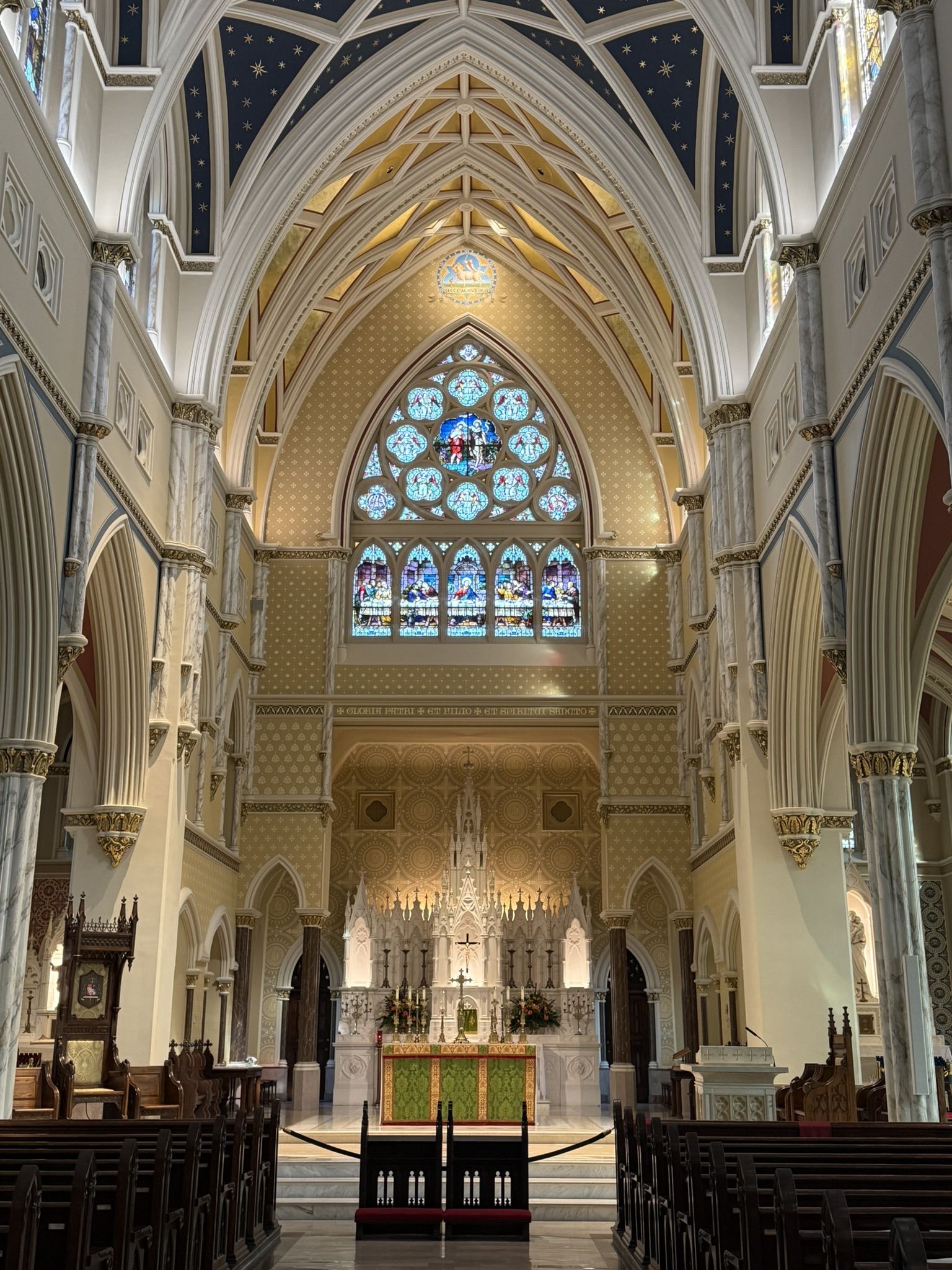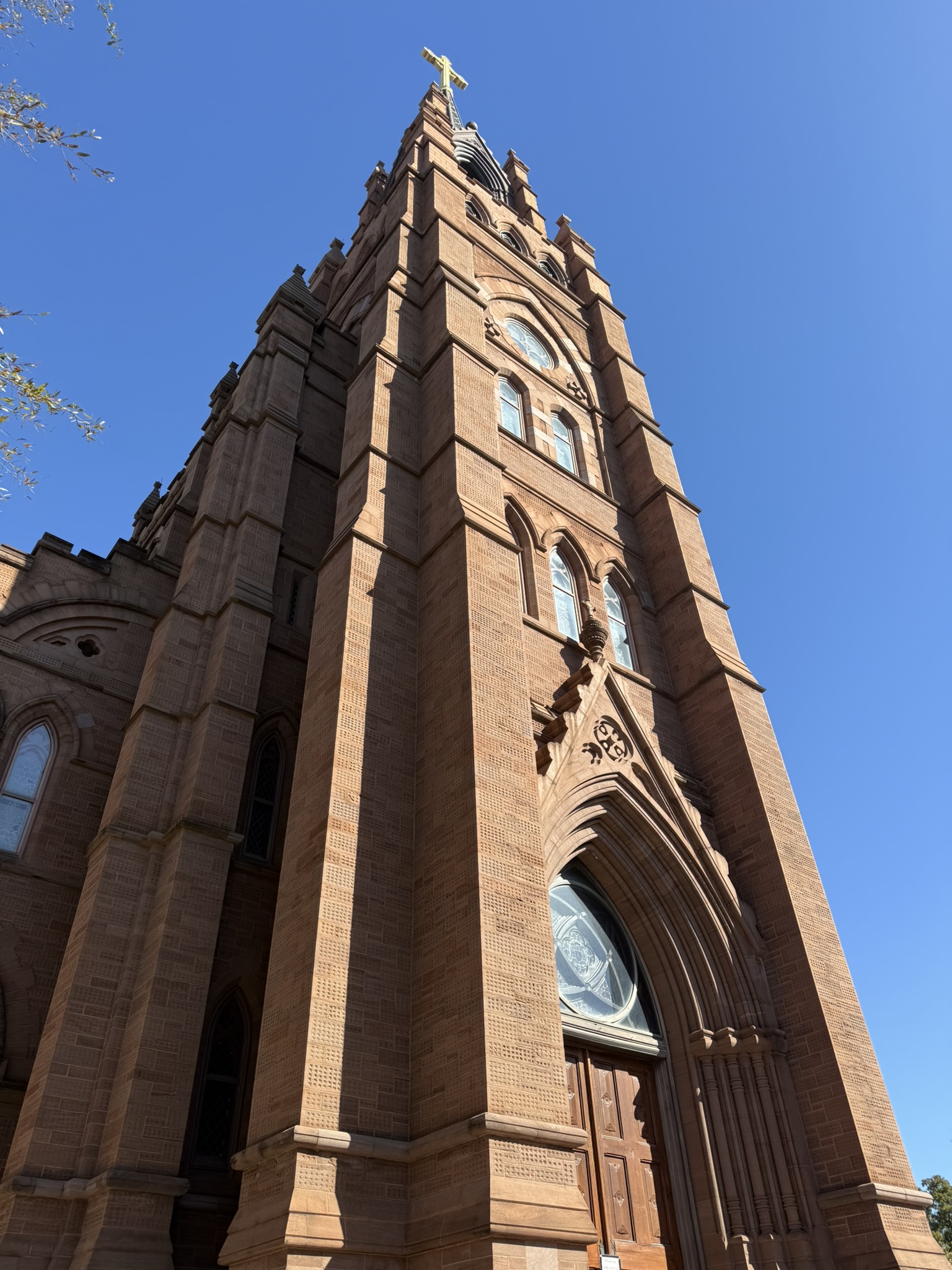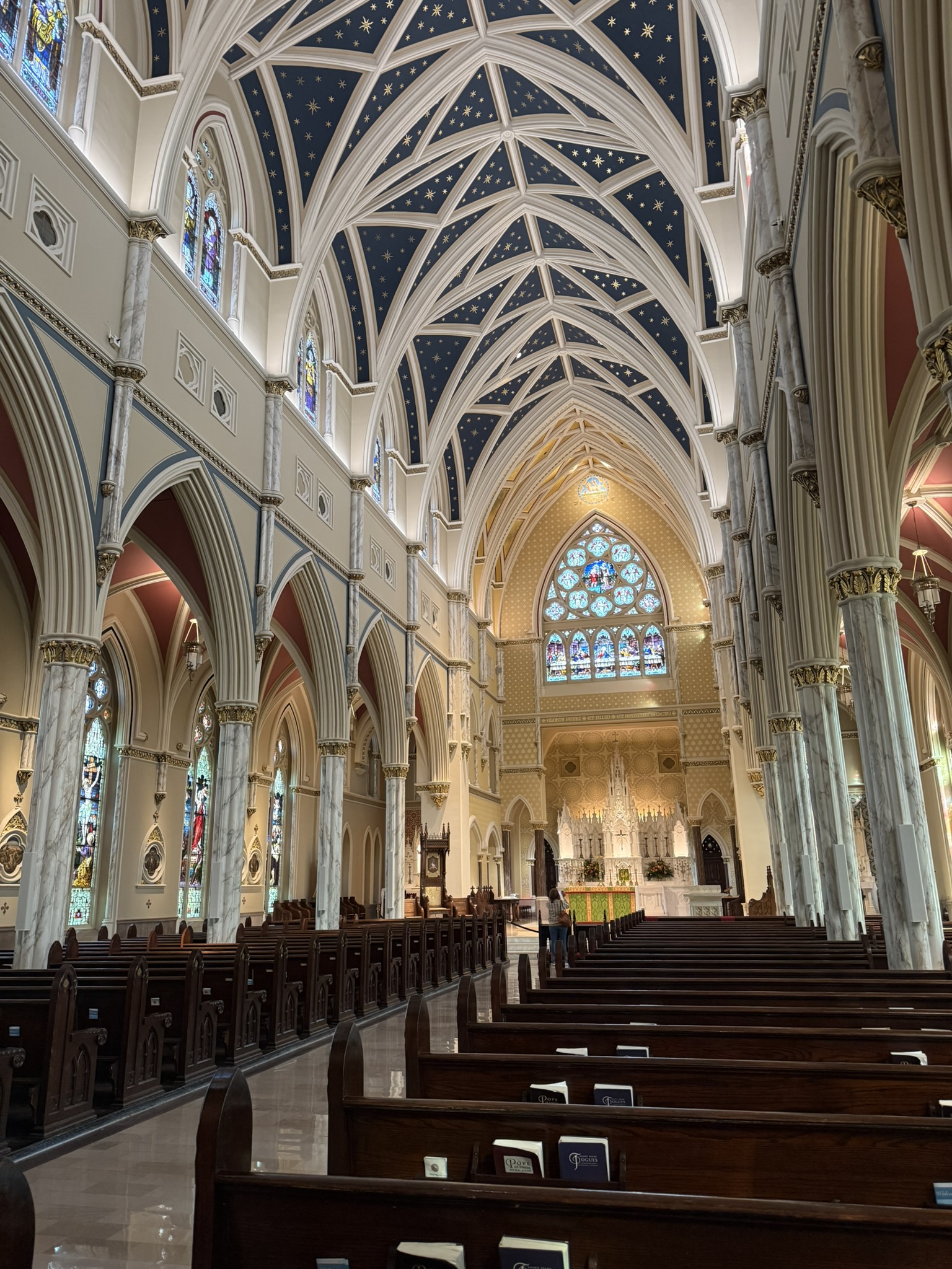 The next morning, we rose kind of early and asked the internet for a church tour. We LOVE old downtowns and old church buildings. We found an itinerary that would work and, after having a delicious breakfast served to our room, we started out. So many beautiful buildings with so much history! At St. John the Baptist’s Catholic Church, we sat quietly in the pew for a bit and took it all in. The gorgeous woodwork, the colorful stained-glass windows, the ornate ceilings and walls, it really was a sight to behold.